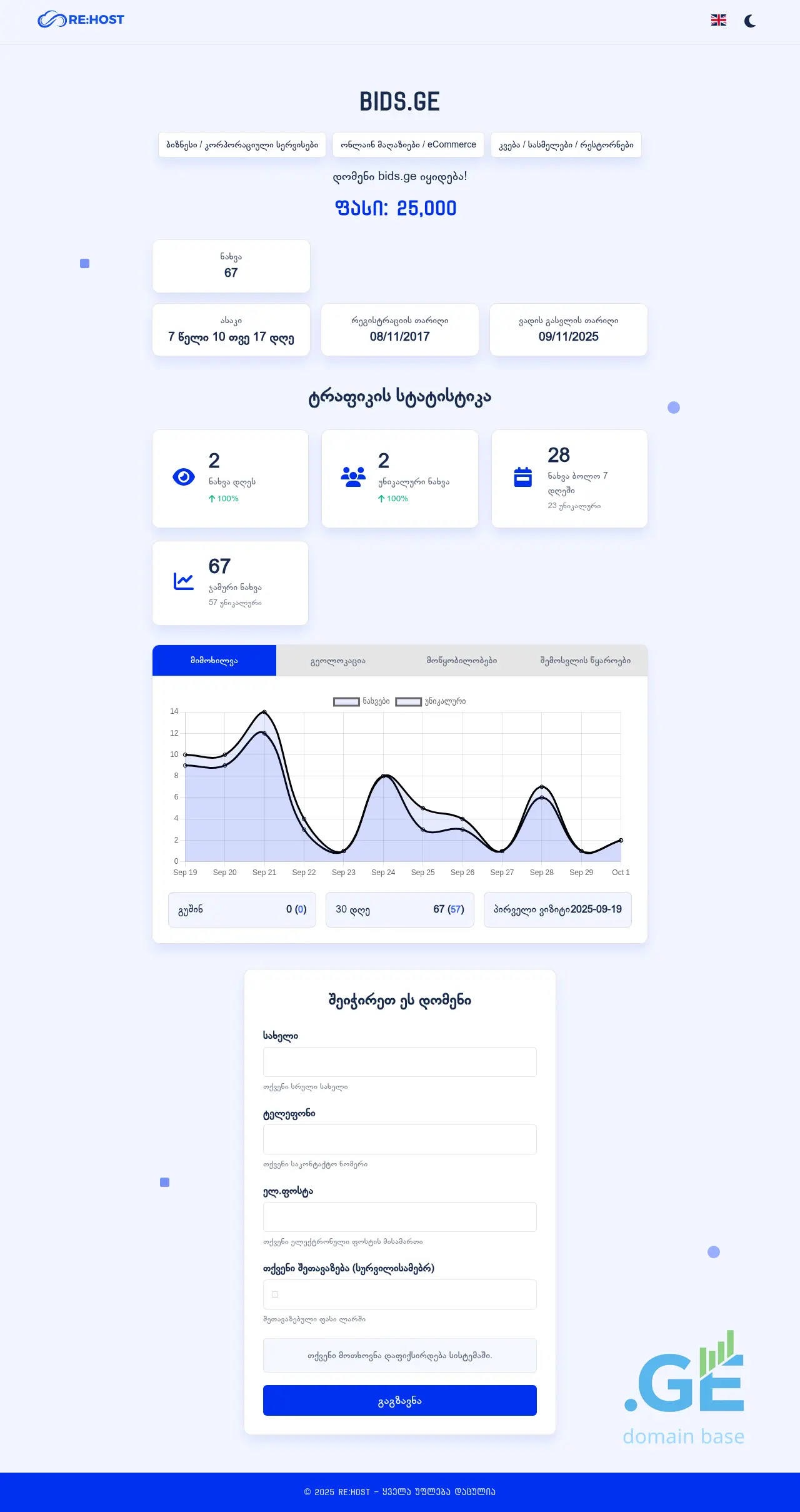 The website bids.ge, titled ««Premium Domain For Sale»», was registered 7 years ago via the registrar NAMESPACE.GE. The primary language of the content is Georgian. Information updated on 01.10.2025 - 00:28.